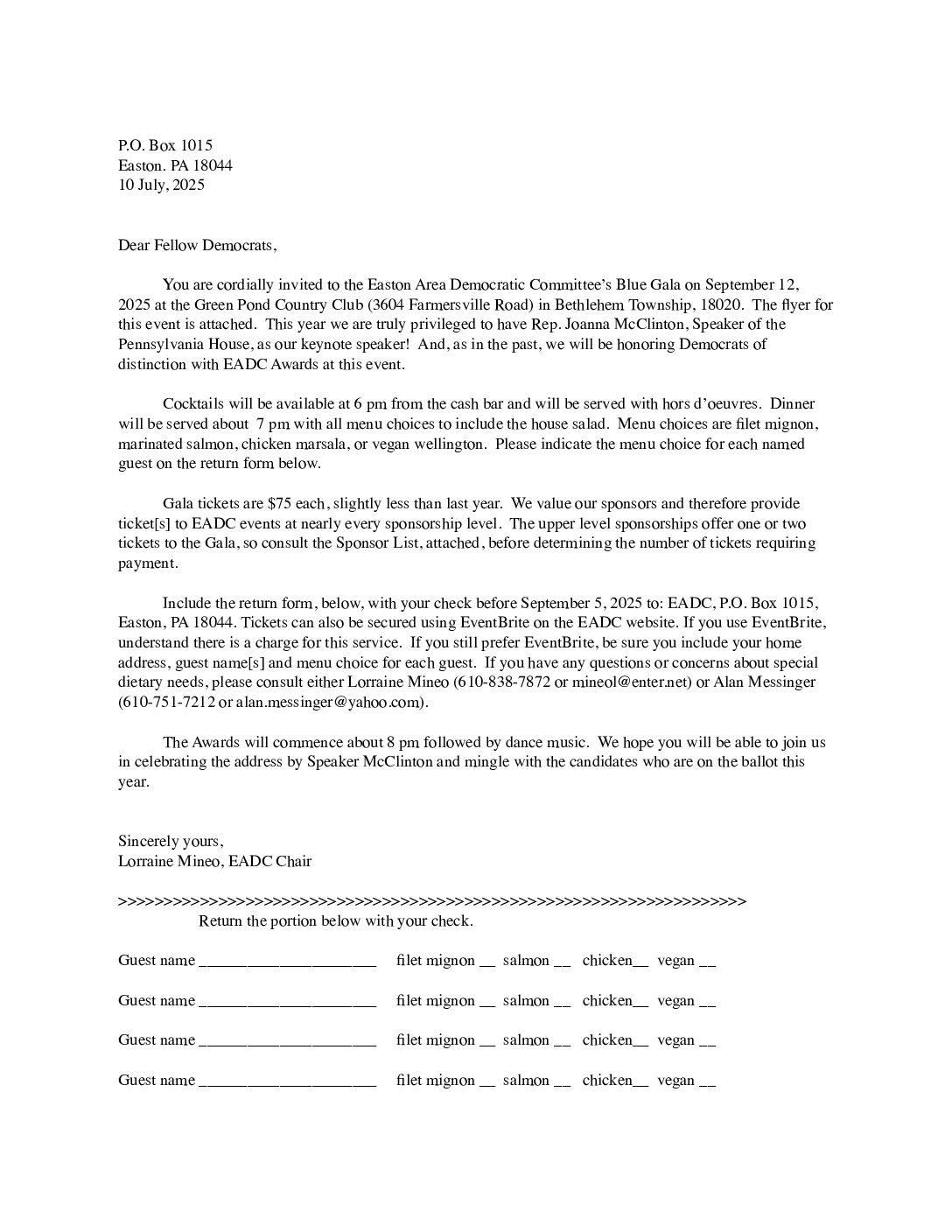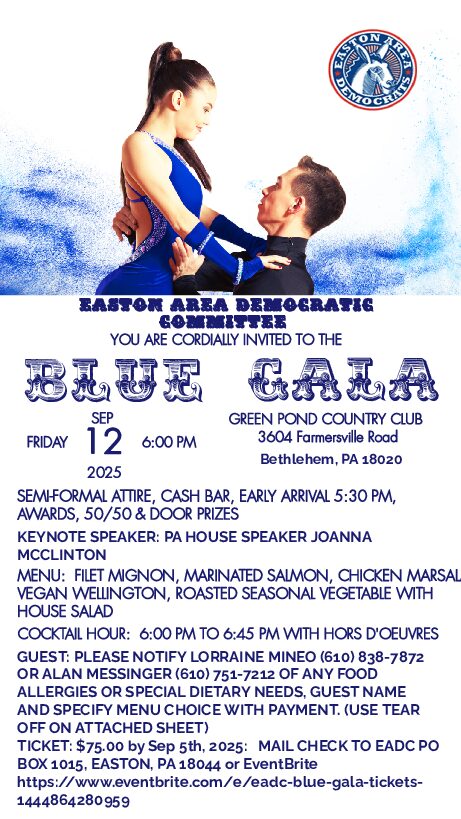 Easton Area Democratic Committee has scheduled its annual Blue Gala 2025. This year’s Keynote Speaker will be the PA House Speaker Ms. Joanna McClinton please come out and enjoy a fabulous night of good food, 50/50 and Door Prizes. Along with a great keynote speaker, some dancing and time to mingle.